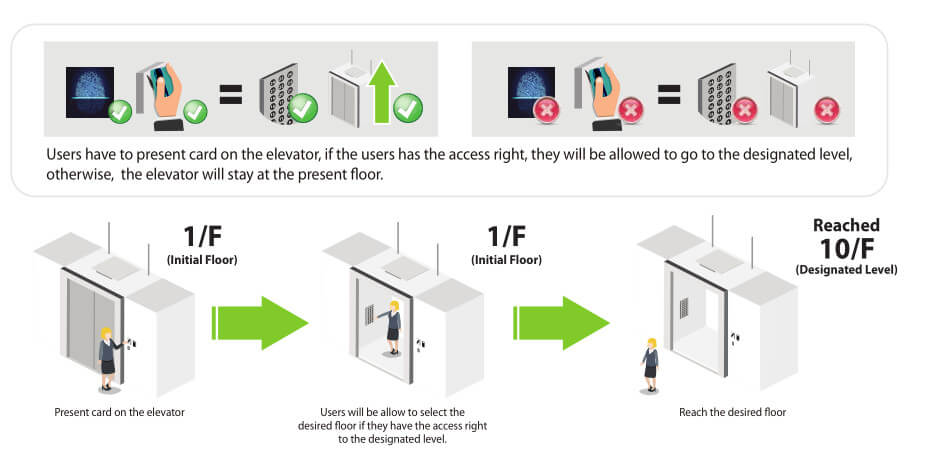 ZKTeco elevator control allows different user to access doors, it can be assigned with different door access rights, and unauthorized users are not allowed to access those important doors. In the actual implementation, users have to present card on the elevator, and the elevator will allow user to reach to the assigned level. This will enable the security management of the whole building elevator access control using the elevator controller installed on each elevator car.