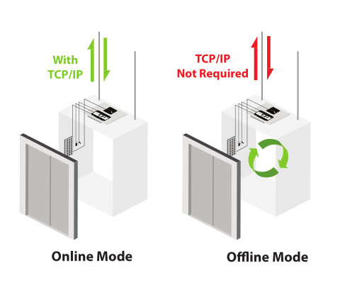 Online Mode: Require TCP/IP, and all elevator access transaction is stored locally in elevator controller and automatically upload to back end server. Offline Mode: Offline data can be read with current