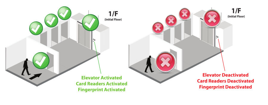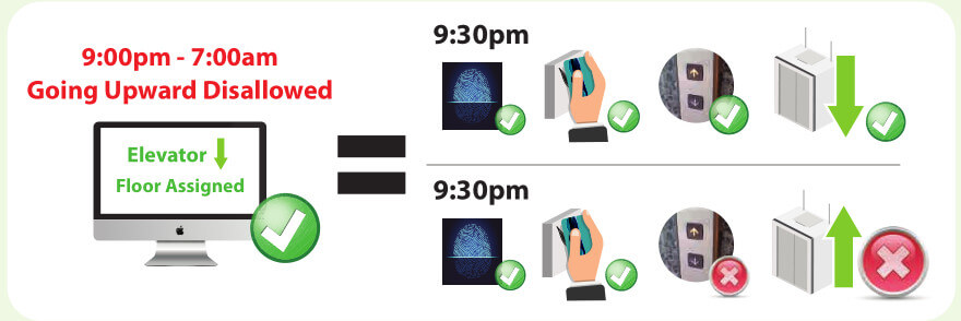 ZKTeco Elevator Control is able to limit elevators’ operation in specific time. For actual implementation, if the elevator control was set to stop operating to go upward between 9:00 p.m. to 7:00 a.m., Unauthorized persons will only be allowed to go downward even with cards for door access.