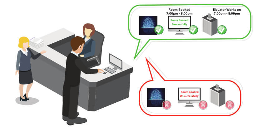 Elevator, control allows users to stop the elevator on the specific time, and grants elevator to operate if the elevator to work if there is a booking for the other location. For example, to book the classrooms for teaching and the elevator, the users just simply click out the corresponding date and time via ZKBioSecurity software web based platform and get approval by pressing a hand or finger to a scanner. This proven and recognized biometric procedure ensures that the person is authorised and has a right to book a room and working time of the elevator.