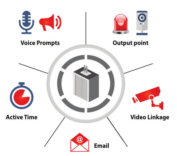 There are multiple tiers to the alert process including Output point, Video Linkage, Active Time, Email Notification and Linkage Voice Prompts.