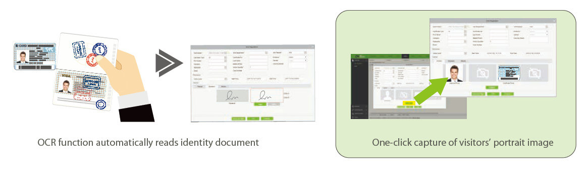 - Supports OCR or ID Card reader to Auto-fill the Visitor’s Basic Info