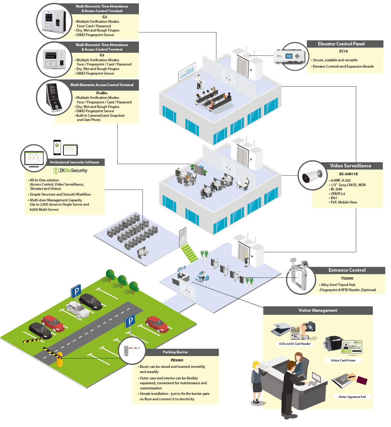 ZKBioSecurity3.0 is the ultimate “All in One” web based security platform developed by ZKTeco. It contains many integrated modules: access control, elevator control, video linkage, visitor management, parking system etc. It provides the most advanced solution for a whole new user experience.