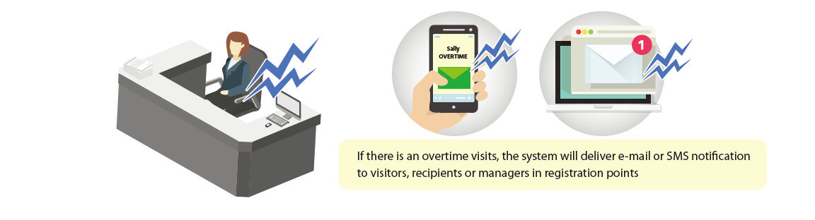 During visitor registration, in case of overtime visits, visitor registration, overtime visitor registration, visitor checking out, monitoring lists, the system will deliver e-mail or SMS notification to visitors, recipients or managers in registration points. SMS and e-mail templates supports customization, templates with different contents, delivery rules and recipients according to conditions can be customized. If it is set to deliver in day of visit, all notifications will be delivered to the specific recipients on specific time.