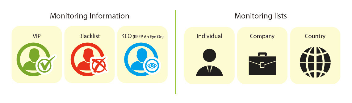 Watch lists are categorized into 3 types: Individual, Company, and Country. Monitoring lists can be generated upon needs, for reception convenience. It supports central management through adding new visitors or previous visitor to watch lists, and is able to mark VIP, KEO (Keep an eye on) or blacklisted. During visitor registration, monitoring information in the system will be matched for further operation by registration manager, e.g. special care taking for VIP, and denial of blacklisted access etc. It is able to perform quick search to individual watch list information and editing of setting.