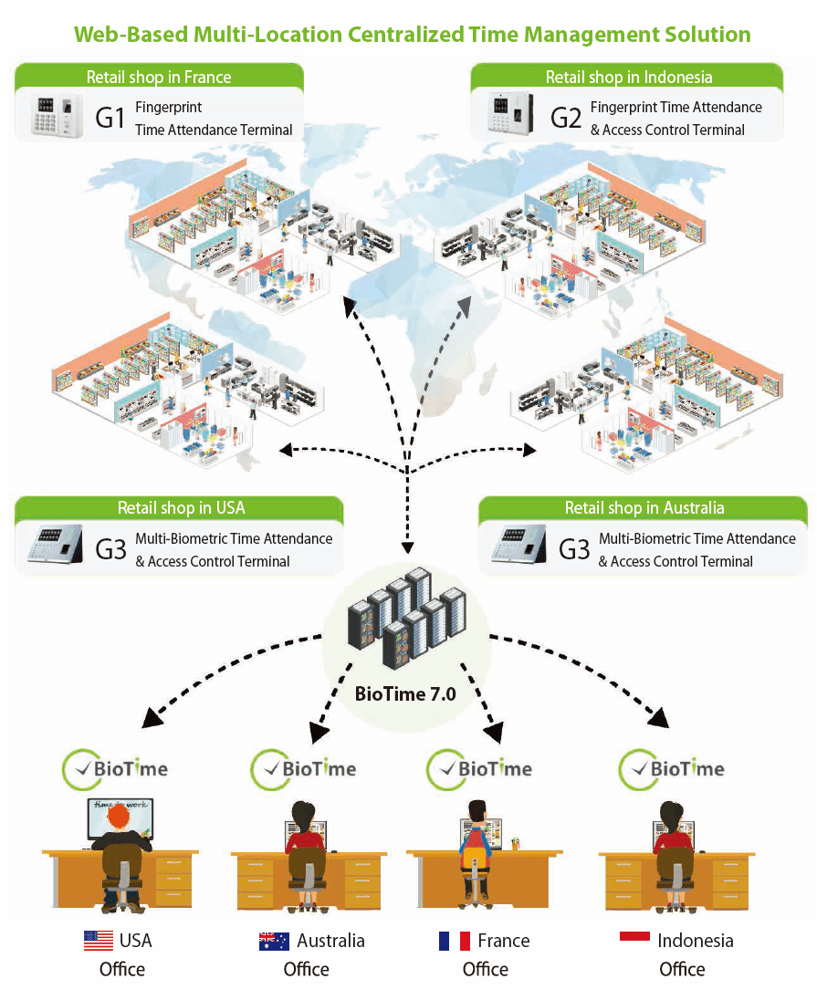 BioTime 7.0 is a powerful web-based time attendance software which offers the most innovative features a time attendance software can offer. It provides a stable communication for devices through LAN/WAN/Wi-Fi/GPRS/3G. Users can access to the software anywhere by their web browser to remotely manage thousands of T&A terminals under complex network (WLAN).